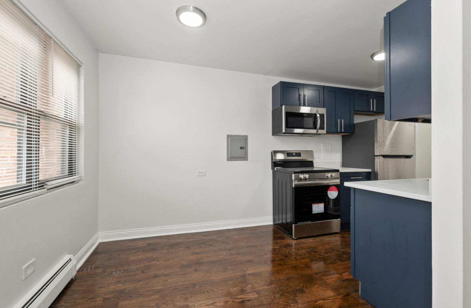 Brand-New Kitchen with modern navy cabinets, sleek countertops, and stainless steel appliances, including a microwave and range.